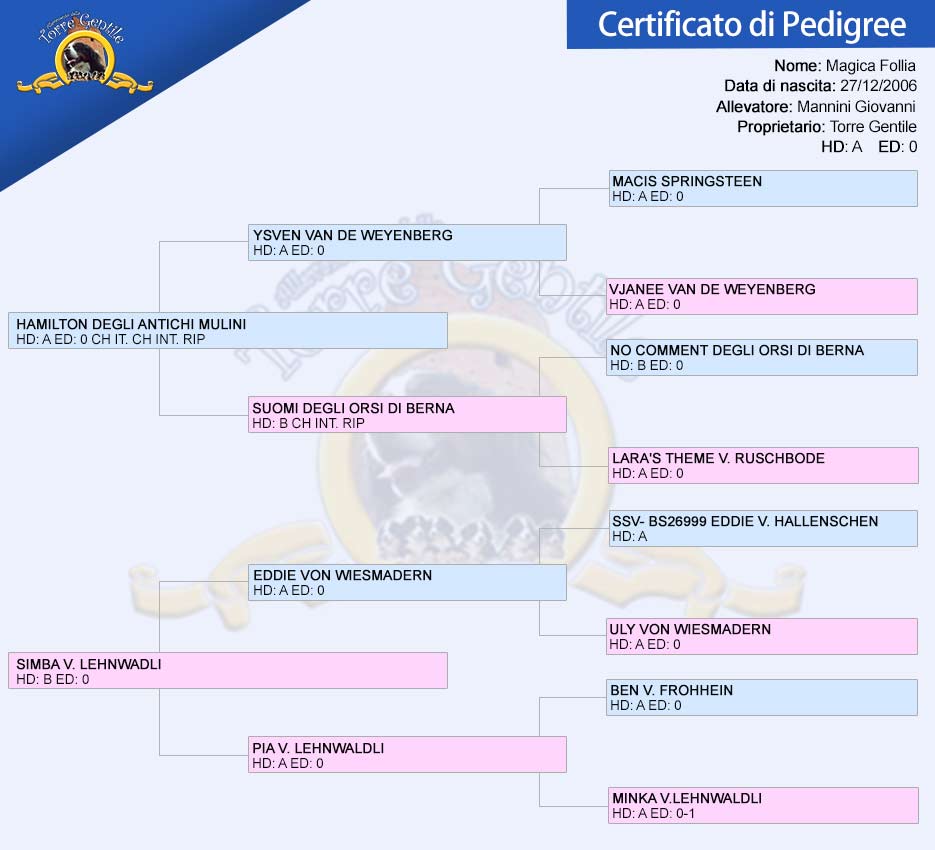 adora i rapporti ravvicinati, molto ravvicinati: il suo naso è frequentemente a contatto con il nostro! È un soggetto con splendida linea dorsale, buon portamento della coda e presenza imponente.
